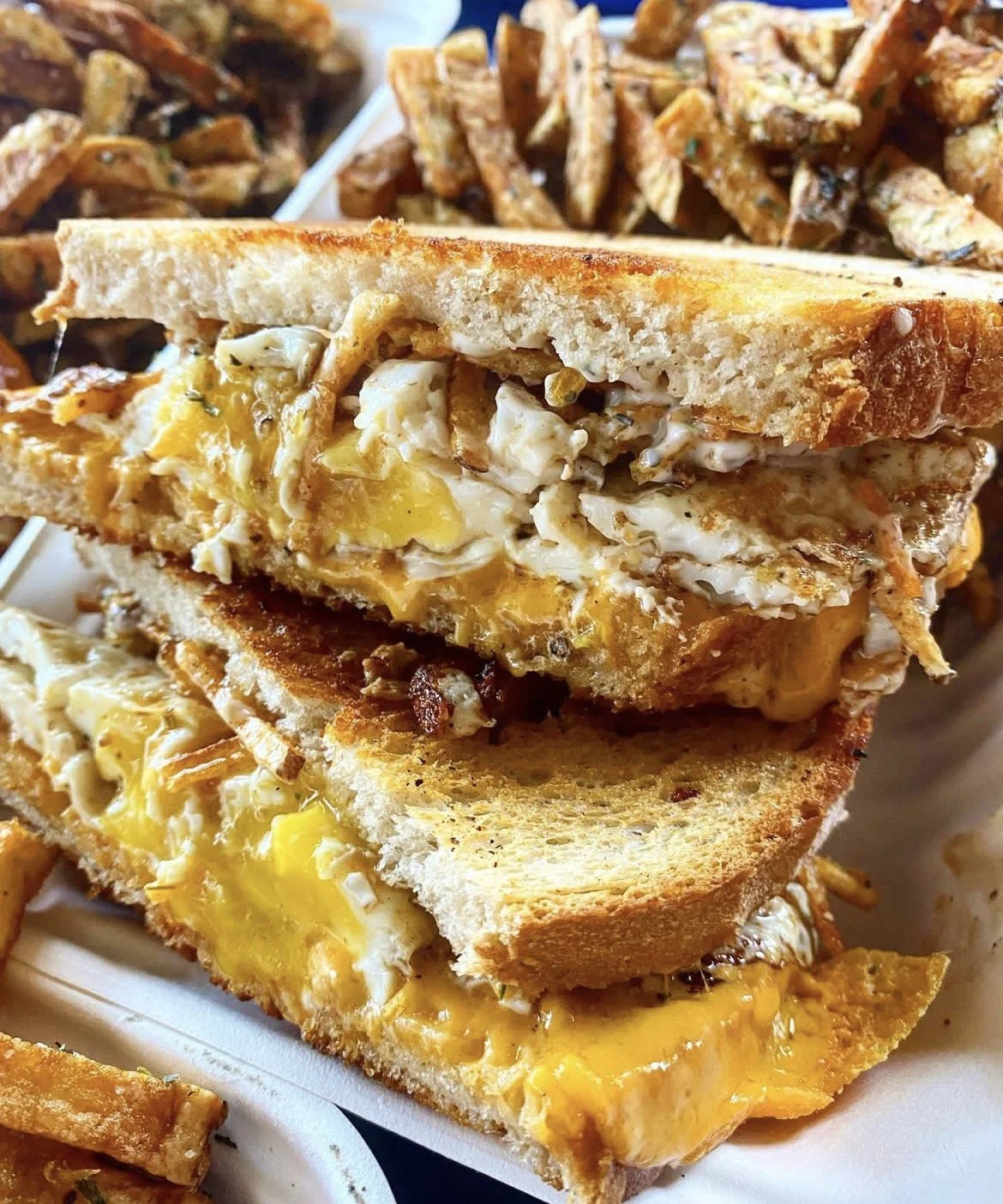 2 fried eggs, smoked mayo, house made hickory sticks melted with aged cheddar between a local sourdough - Add Bacon or Peameal $3
